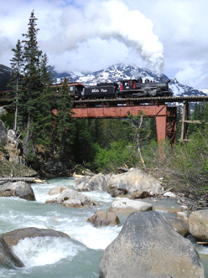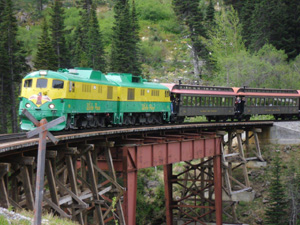 Die Schmalsprbahn mit einer Spurweite von 914mm ist wirklich eine Eisenbahn der Superlative und führt von Skagway in US Alaska am Pazifik über den White Pass (873 m ü.d. Pazifik) nach Whitehorse, wobei der Streckenabschnitt von Carcross im Yukon Territorium nach Whitehorse seit beinahe 3 Jahrzehnten stillgelegt, aber nicht abgebaut ist. |