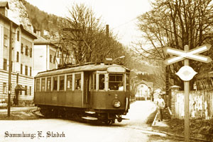 Arbeiten, die man sobald als möglich in Angriff nahm. Mit zwei Elektrotriebwagen und vier Beiwagen, die von der Grazer Waggonfabrik hergestellt wurden, nahm man am 1.September 1926 der Personenverkehr auf, um Touristen zur 1. Seilschwebebahn Österreichs, die im selben Jahr auf die Rax eröffnet wurde, zu befördern. Um den Fahrgästen einen längeren Fußweg zu ersparen, wurde 1927 die Strecke in Hirschwang um ca. 850 m zu der nahe der Talstation der Raxseilbahn gelegenen Windbrücke verlängert. Zur gleichen Zeit erweiterte man die Gleisanlage im Bahnhof Payerbach, um den Reisenden den Umstieg von der Südbahn auf die Lokalbahn zu erleichtern. Die Güterzüge wurden weiterhin mit den kleinen E – Loks und einfachen Güterwaggons, die größtenteils noch Holzrahmen aufwiesen, geführt. Am Fahrzeugpark änderte sich in den folgenden Jahren bis zum 2. Weltkrieg wenig, sieht man von der Beschaffung einer Werksverschublok für die Papierfabrik in Hirschwang ab, es gab jedoch Projekte für neue Güterzugslokomotiven und für die Einführung des Rollwagenverkehrs. Durch den nach dem 2.Weltkrieg stetig wachsenden Straßenverkehr kam es insbesondere in Hirschwang immer wieder zu Kollisionen zwischen Lokalbahnzügen und Straßenfahrzeugen. | |