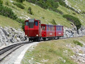 In der zweiten Hälfte des 19. Jahrhunderts (1800 - 1900) entwickelte sich – nicht zuletzt Dank der Eisenbahn als Beförderungsmittel – ein stetiger Ausflugsverkehr. Die städtische Bevölkerung suchte die Alpen zur Erholung und für den Genuß des Ausblickes von den Bergen auf. Für gut betuchte Bürger gab es früher die Möglichkeit, Maultiere oder Tragsessel als Aufstiegshilfe zu benutzen, wenn sie sich eine anstrengende Wanderung ersparen wollten. In der Schweiz entstanden zu dieser Zeit Ende des 19. Jahrhunderts die ersten Zahnradbahnen, wie etwa im Jahre 1871 auf den Rigi, die es ermöglichten, große Besucherströme in kurzer Zeit auf den Berg zu befördern. In Österreich gab es zur selben Zeit Pläne für eine Zahnradbahn auf den Schneeberg bei Wien und für eine Bahn auf den Schafberg im Salzkammergut. Bereits im Jahre 1872 erhielten Ing. Berthold Curant und Dr. Carl Peusens die Konzession für eine Zahnradbahn auf den Schafberg. Die Wirtschaftskrise im Jahre 1873 beendete deren Vorhaben. So waren die 1874 eröffnete Bahn auf den Kahlenberg in Wien und die Budapester Schwabenbergbahn die ersten Zahnradbahnen in Österreich-Ungarn. | |